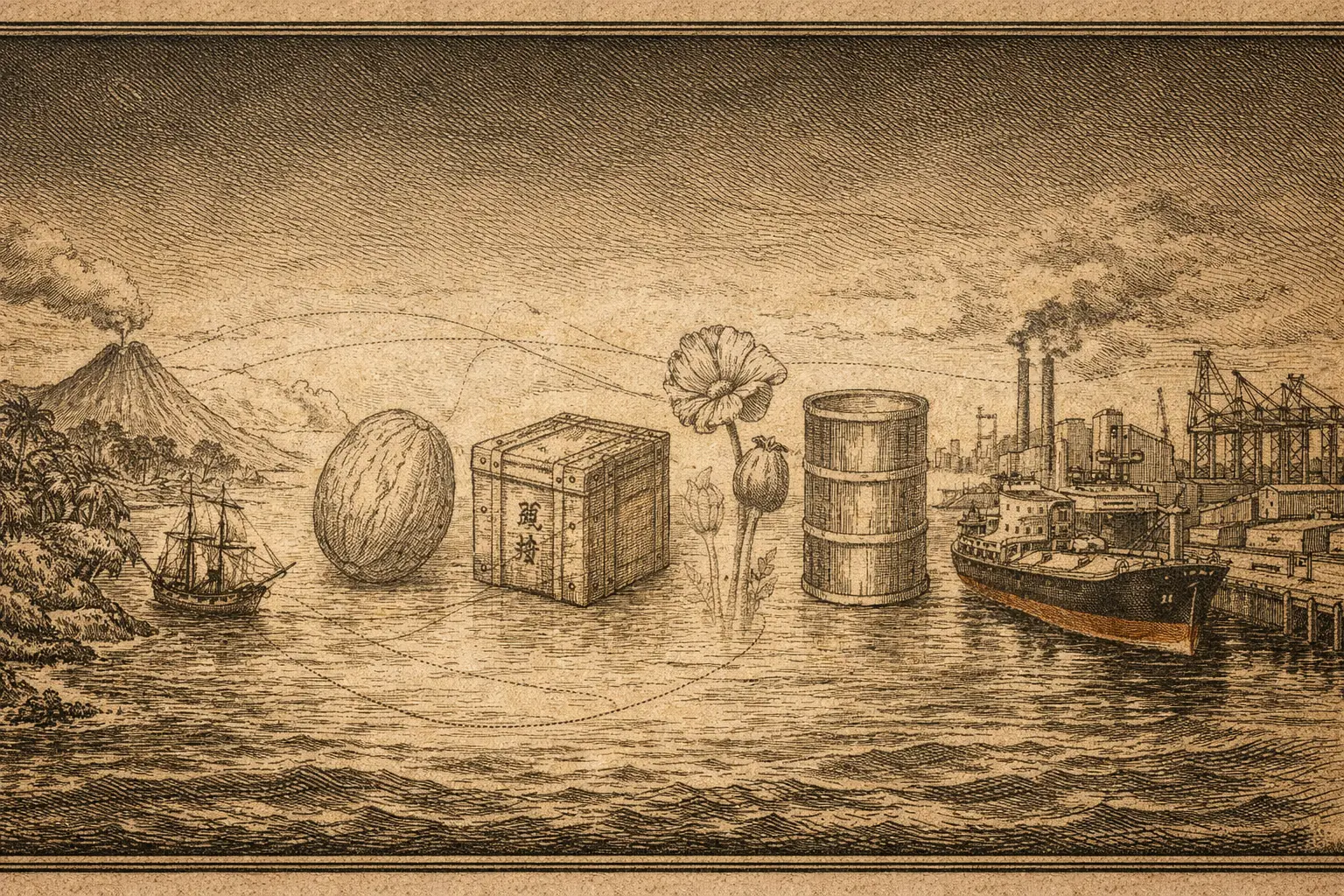 Four episodes across four centuries — nutmeg, tea, opium, oil — tracing a single pattern: a commodity becomes worth fighting...
